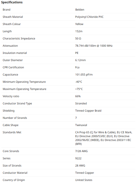 Belden, 9222 series Tinned Copper Braid Yellow Triax cable, 6.12mm OD 152m, 50 Ω impedance